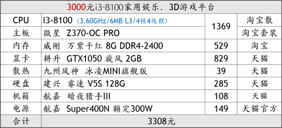 这一套和上面一套相比,平台直接升级到了第八代i3四核+Z370,未来升级潜力巨大,等有钱了可以加装机械硬盘以及升级成GTX1060显卡。当然,如果不升级,一般的吃鸡也是没有任何问题的,GTX1050性能也还是不错的。如果以后不升级了,主板可以换成B360或者H310。