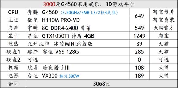 G4560+GTX1050Ti(4GB),目前来说,G4560的光辉差不多也就只能发挥到这个地步了。这一套配置算是低预算中比较适合吃鸡以及玩大型游戏的一套选择。这一套可以用来吃鸡以及玩主流的大型3D游戏。