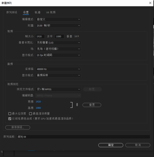 2,按照图中所示新建一个1920*1080 25帧 方形像素 无场的序列