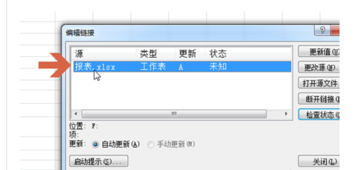 3、点击后,会弹出编辑链接界面。在界面中可看到表格中所存在的链接。记住链接的文件名。本例中是“报表”。