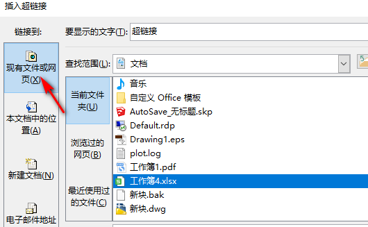 3、进入插入超链接页面,点击左侧的现有文件,然后选择文件,点击插入。
