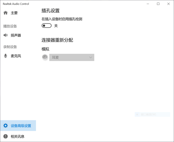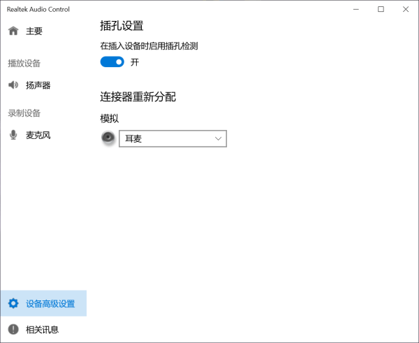将“插孔设置”下的“在插入设备时启用插孔检测”的状态切换为开;
