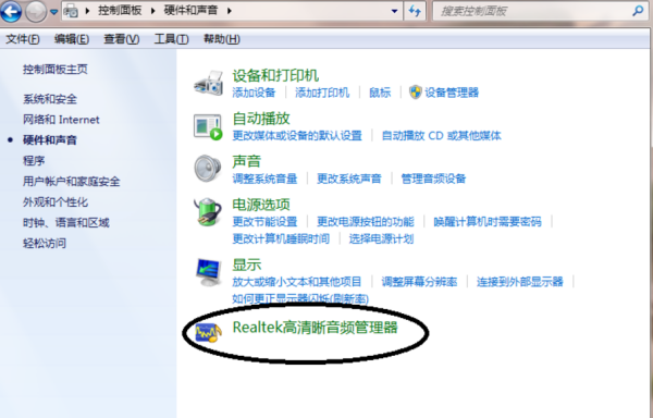 2、进入“硬件和声音”,在打开的页面里选择“Realtek高清晰音频管理器”;