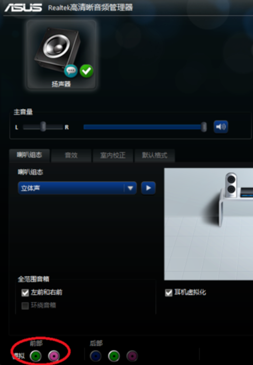 5、返回“Realtek高清晰音频管理器”主页面,单击左下角的前部插孔对插孔进行设置,完成后插入耳机即可。