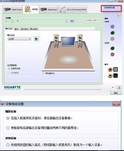 3.在右上角设备高级设置中选取“允许前部和后部设备同时播放两种不同音频”即可。