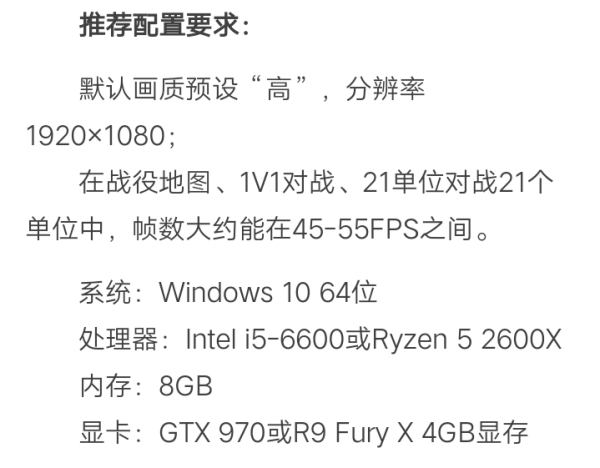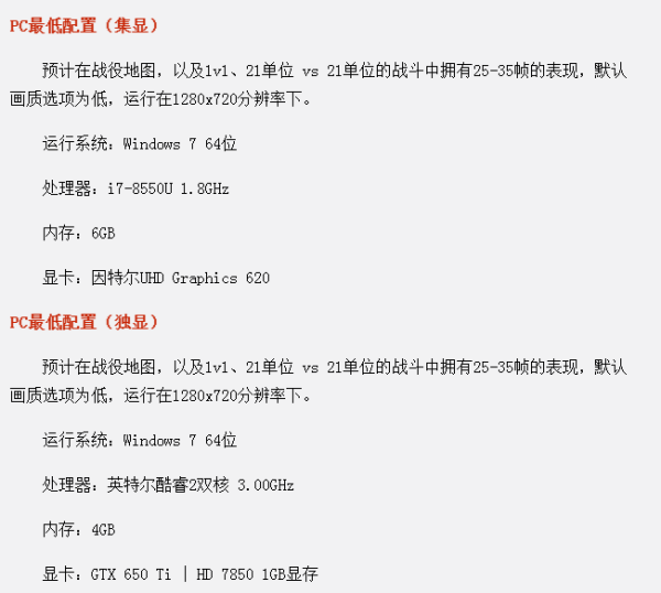 最低配置(核显): 只能满足战役地图1v1、21个单位vs 21单位的战斗,默认预设画面是低,分辨率为1280x720,达到25-35FPS 系统:Windows 7,64位 处理器:i7 8550U,1.8GHz 内存:6GB 显卡:Intel UHD Graphics 620 这个是官方的核显最低配置要求,估计可以进游戏。但是要愉快的玩耍感觉还是不行。这种轻薄本还是不要想这么多的好。相关文章