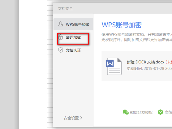 2、在安全页面中找到文档加密选项,点击该选项进入至文档加密主页面中。