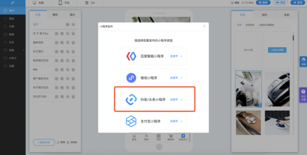 在设计好模板后,点击右上角“发布”按钮,选择对应的发布平台渠道,配置APPID和密钥,进行打包小程序并下载到本地。