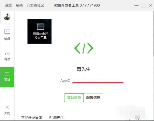 4、配置小程序项目的本地目录,这里暂且使用F盘/毒先生 作为示范。接着在网上下载一套小程序模板源码。