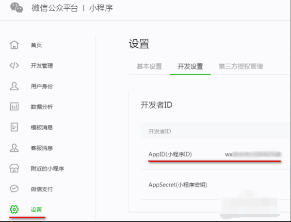3、小程序的APPID需要打开浏览器,登录网页版微信小程序管理后台。设置-开发设置-复制AppID。