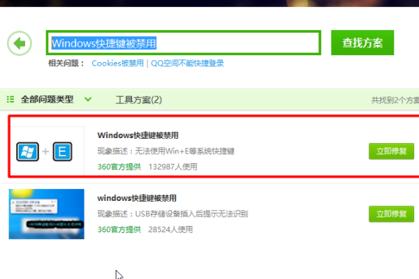 第二步、在搜索框中输入“Windows快捷方式被禁用”搜索问题的解决方案。