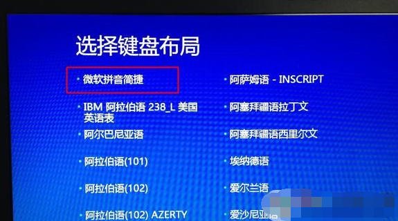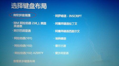 3、选择键盘布局,选择微软拼音,进入中文界面;