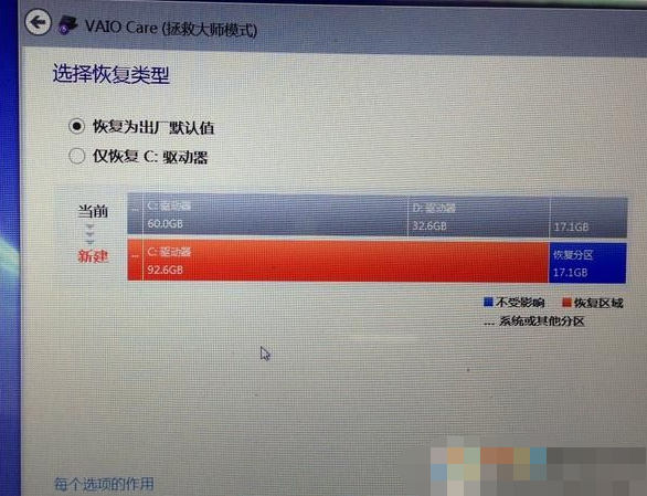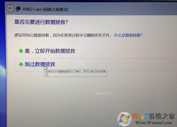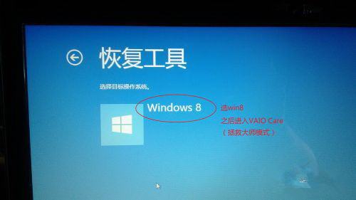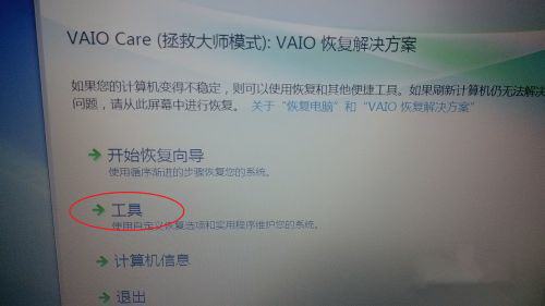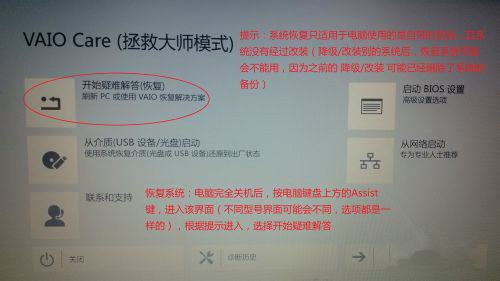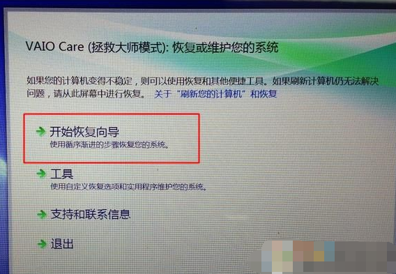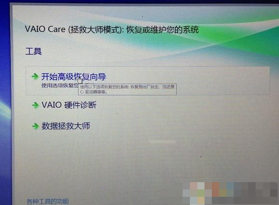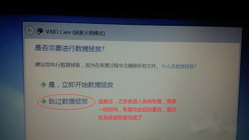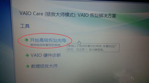 (3)进入VAIO Care(拯救大师模式),根据提示进行一键恢复,接着选第二项:工具--选开始高级恢复向导---选跳过数据拯救 --最后是勾选 开始 这样恢复系统就开始了,大概40分钟到1个小时,恢复完系统会重启,这样就代表成功了
