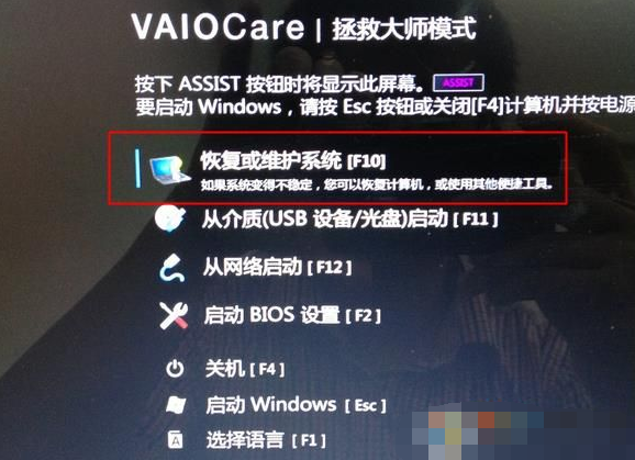 2、启动进入VAIOCare拯救大师模式,选择“恢复或维护系统”;这是sony独有的哦。