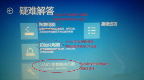 (2)接着选择选第一项回复维护系统 ,然后选微软拼音 ---选疑难解答 ---选VAIO恢复和解决方案 --选WIN8之后进入VAIO CARE(拯救大师模式)。