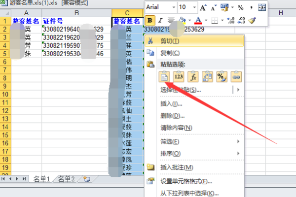 4、点击名单1表格,在空白的区域点击右键选择粘贴按钮,将名单2个的数据粘贴到名单1表中。