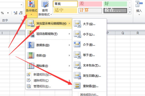 6、选中全部数据以后点击表格上方的条件格式,并在出现的选项中选择突出显示单元格规则下面的重复值选项。
