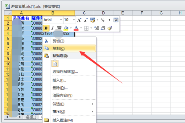 3、选中名单2表格中的数据,点击右键选择复制按钮。