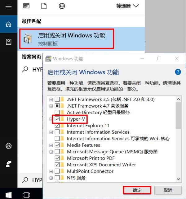 左下角搜索框,搜索并选择【启用或关闭Windows功能】,勾选【Hyper-V】服务,点击确定