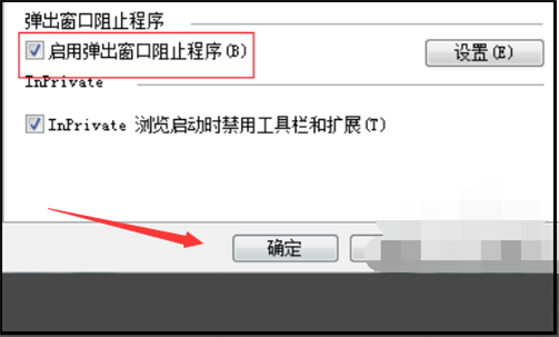 3、点击隐私之后进入新的界面,可以看到有一个启用弹出窗口阻止程序的选项,点击前面进行勾选此项,然后点击最下面的确定即可,这样就不会再自动弹出网页了。