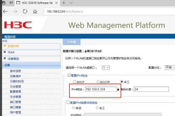 6、到这个页面时就可以设置管理IP了,根据自己公司内网的IP地址段来更改IP地址。