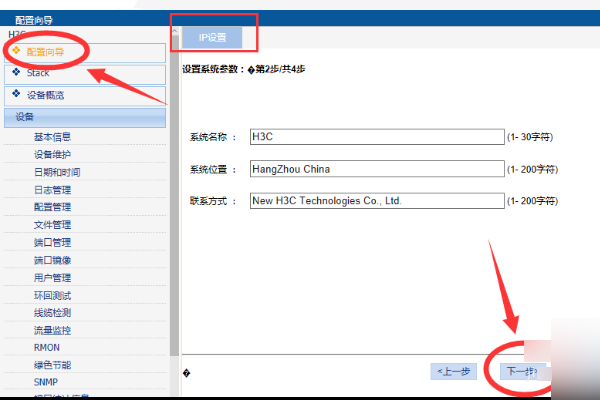 5、登录后点第一个菜单的【配置向导】-【IP设置】根据自己的需求进行设置,设置完后点【下一步】。