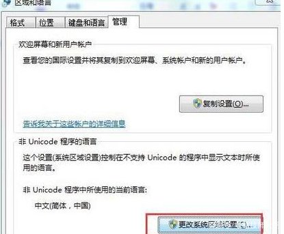 (3)最后在切换至”管理”选项界面点击“更改系统区域设置”将当前系统区域设置改为“中文”,改完后重启计算机、详细操作步骤如下图所示、