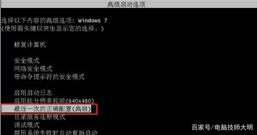 首先第一种方法:开机一直按“F8”选择“最近一次正确配置“,详细操作步骤如下图所示、
