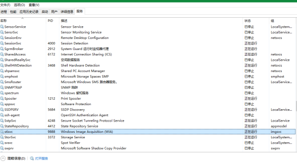 找到stisvc服务,描述里就是Windows Image Acquisition (WIA),试一下右键单击可否停止。如果无法停止,记住这个服务的PID,然后到详细信息选项卡里找到对应的svchost进程,右击结束任务。然后回到服务选项卡,右击stisvc服务,选择开始,服务就重新启动了。