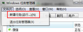 2.在任务管理器中点击文件,选择新建任务(运行...)。
