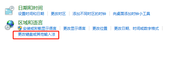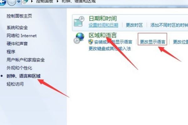 3、出现日期和时间、区域和语言两个选项,点击区域和语言下的“更改显示语言”。