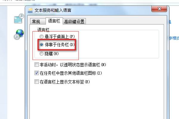 5、弹出窗口中点击“语言栏”点击“停靠于任务栏上”,搜狗输入法即可出现。