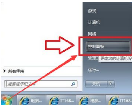 1、直接点击电脑桌面左下角的桌面图标,在弹出的窗口中,找到并点击控制面板。