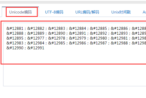 四、打开之后,点击Unicode编码,并把下面这一列编码粘贴进入㉑;㉒;㉓;㉔;㉕;㉖;㉗;㉘;㉙;㉚,点击Unicode转中文。