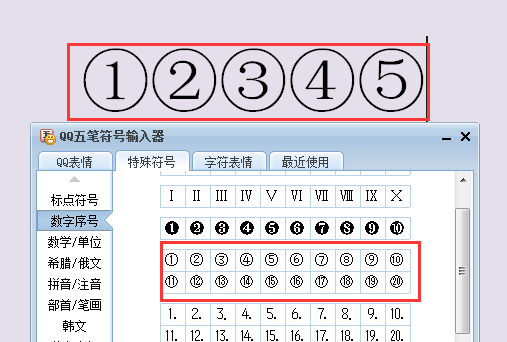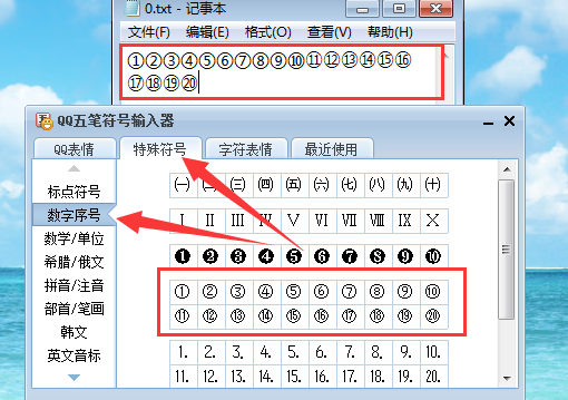 二、 打开符号输入器后,进入特殊符号—数字序号,点击右边的带圈1—20即可输入。