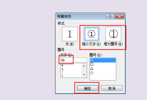 4、在弹出的对话框中选择圈号“○”,由于数字占空间较大,要选择“增大号圈”,然后点击“确定”。