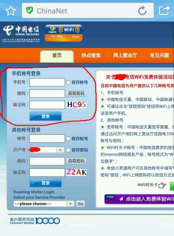 第二步,第一次打开网页后会弹出输入账号、密码的页面,输入账号密码即可上网。(天翼手机用户的手机号就是WiFi的登录账号,密码在登录页面上点击获取密码就可将密码短信发送到天翼手机上)