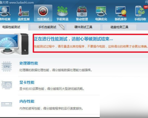 2、点击上方红色方框(性能测试)按钮开始测试电脑。