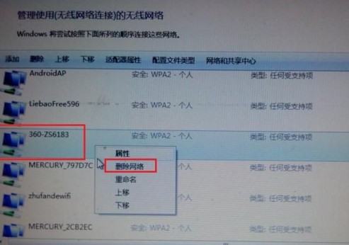 2.在管理无线网络窗口中,选中对应的有红叉的无线信号,按下鼠标右键,在右键菜单栏中选择“删除网络”