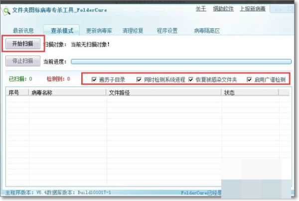 12、此时将打开“文件夹图标病毒专杀工具”,按如图所示,点击“开始扫描”按钮。并在弹出的“扫描位置”界面中选择“U盘”作为目标进行扫描。