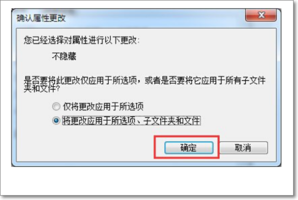 7、并在弹出的窗口中直接点击“确定”按钮即可恢复被隐藏的文件和文件夹。