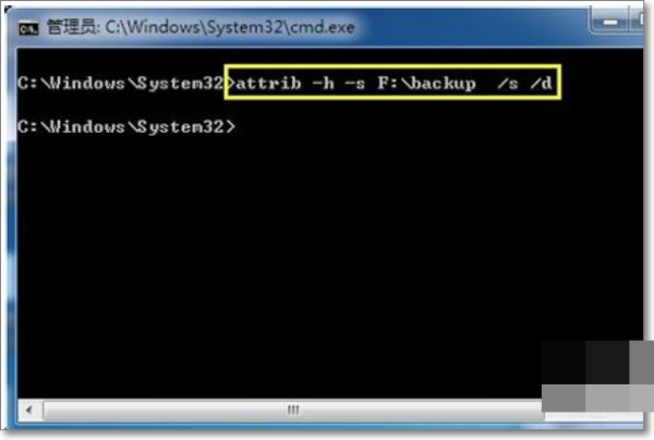 9、从打开的MSDOS命令中,输入命令“attrib -h -s F:\backup /s /d"并按回车键即可将F盘(U盘盘符)中文件夹backup中的所有隐藏、系统文件属性删除掉。