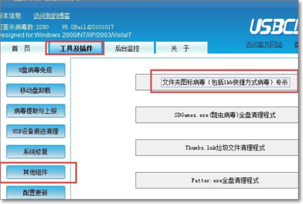 11、运行“U盘病毒专杀工具”程序,切换到“工具及插件”-“其它组件”选项卡,点击“文件夹图标病毒专杀”按钮。