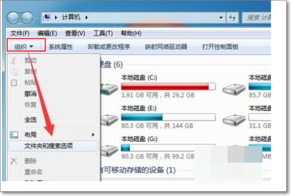 1、当u盘中的文件忽然不显示时,其实是U盘受到病毒的感染而被隐藏掉了。对此我们需要通过设置显示隐藏文件和文件夹。打开“计算机”,点击“组织”下拉菜单,从中选择“文件夹和搜索选项”项。