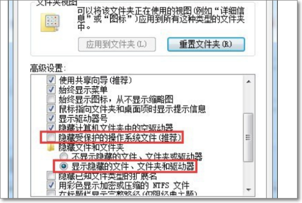 3、清除勾选“隐藏受保护的操作系统文件”,选择“显示隐藏的文件、文件夹和驱动”。