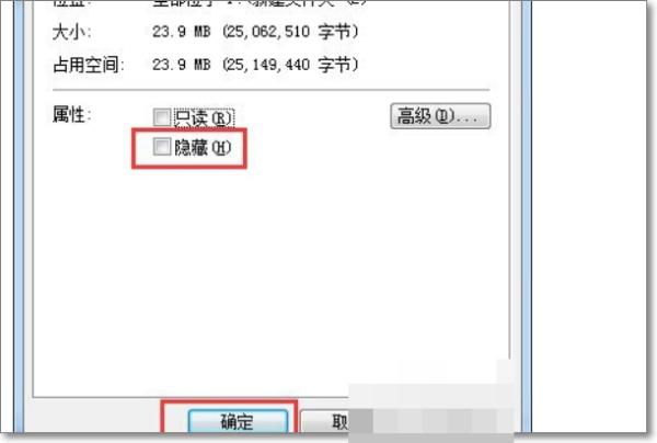 6、从打开的“文件属性”窗口中,清除勾选“隐藏”项,点击“确定”按钮。