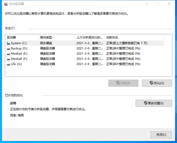 13、双击电脑桌面上“此电脑”或者“计算机”或者“我的电脑”鼠标,依次分别指向各个分区C、D、E、F,点右键——“属性”——然后切换到“工具”—— “优化”——“优化”,然后依次对各个分区C、D、E、F进行优化并整理碎片,你就等着吧,可以去休息一会了。如果以前从来没有运行过这个程序的话,而且你的硬盘很大,那么可能得1个小时多的时间(如果觉得时间长,可以停下来,分几次以后再运行也可以)。这个程序以后应该1个月左右运行一次,第二次以后运行时间就短多了。