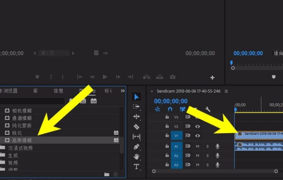 三、在效果当中,我们找到视频效果,点击打开,在视频效果中找到高斯模糊,把高斯模糊做一个效果图,拖动到我们想要添加模糊的视频上面,如下图所示。