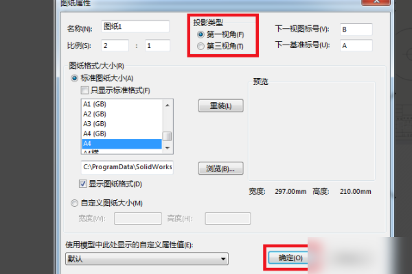 2、在弹出图纸属性选择框中,修改“投影类型”中的透视图,选择“第一视角”,最后单击“确定”。