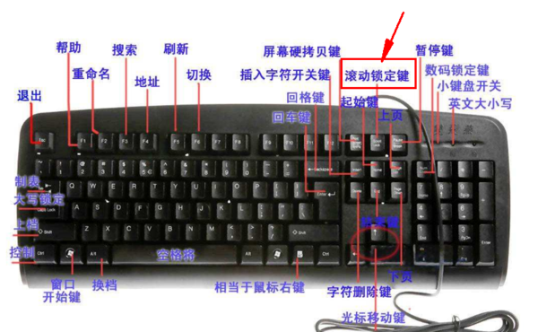 四、ScrollLock指示灯:点击键盘上的ScrollLock键即可开启该指示灯,它是滚动锁定键。基本上使用电脑时很少用到该键。只在一些特定的程序使用,如Excel中,当该灯熄灭时,我们按键盘上的方向键,会将光标移至下一个单元格中;但当该标示灯按亮后,按键盘上的方向键,会锁定光标而滚动页面。